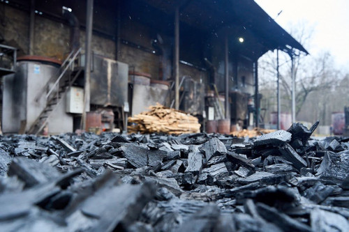 Процес виготовлення деревного вугілля відбувається в спеціальних піролізних теплогенераторах, де відходи переробки дуба (обрізки), розкладаються в безкисневому середовищі під впливом високої температури (близько 450 *С) та проходить процес очищення від газів та смол. Після випалювання проходить процес охолодження та пакування згідно вимог замовника.