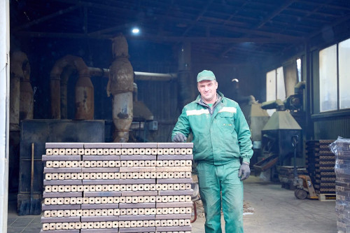 Брикети "Pini-Kay" виготовляються на 85-90% з тирси дуба, та 10-15% сосни. Тирса просіюється та змішується через калібратор з подальшою подачею в сушильний барабан, з якого сировина виходить вологістю не більше 6-8%. Висушена тирса прямує в прес-екструдер, де при високій температурі і тиску формується в трубчатий чотиригранний брикет. Після охолодження брикети упаковуються по 10кг. термоусадочною плівкою та укладуються в європіддон по 960кг. та відправляються покупцям.